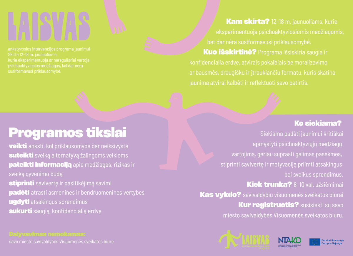Ar žinote jaunuolį, kuris eksperimentuoja ar nereguliariai vartoja alkoholį ar kitas psichoaktyviąsias medžiagas? Ankstyvosios intervencijos programa „Laisvas“ skirta 12–18 metų jaunuoliams, siekiant padėti jiems kritiškai įvertinti savo pasirinkimus ir priimti sveikesnius sprendimus ateityje.