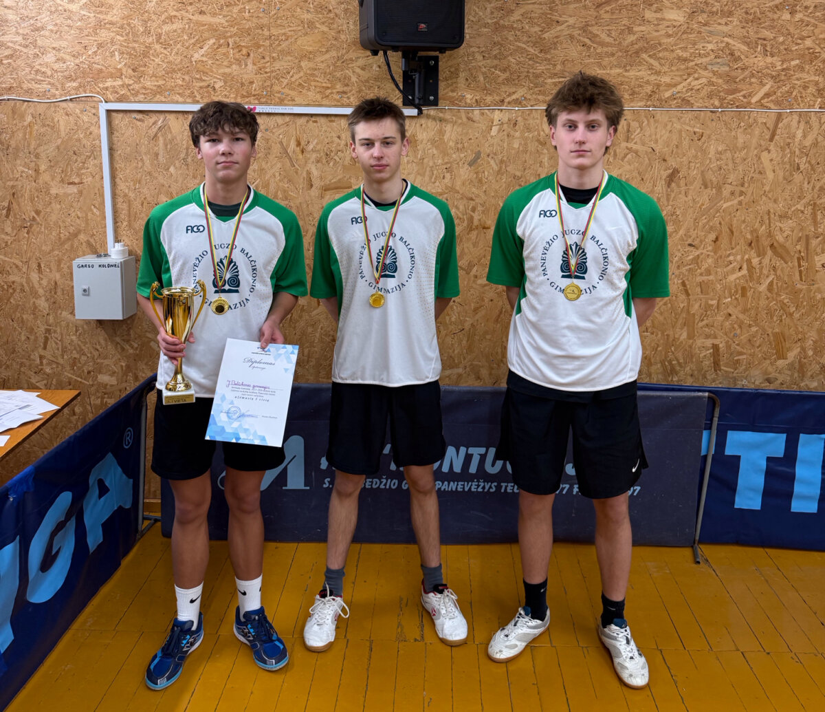 Tęsiasi Lietuvos mokyklų žaidynys. Panevėžio mokyklų merginų ir vaikinų komandų stalo teniso varžybose mūsų gimnazijos vaikinų komanda iškovojo I vietą ir gins Panevėžio miesto garbę zoninėse varžybose Utenoje. O merginų komanda laimėjo II vietą. Sveikiname gimnazijai atstovavusias merginų komandos žaidėjas Deimilę Šulskytę (II d), Mildą Čečionaitę (I f), Korneliją Šerėnaitę (I f), Emą Rutkauskaitę (I a) ir vaikinų komandos žaidėjus Mantą Padarauską (II a), Justiną Žilį (II e) ir Simą Ulinską (II f). Linkime sėkmės zoninėse varžybose. Dėkojame fizinio ugdymo mokytojui Mindaugui Barzdeniui.
