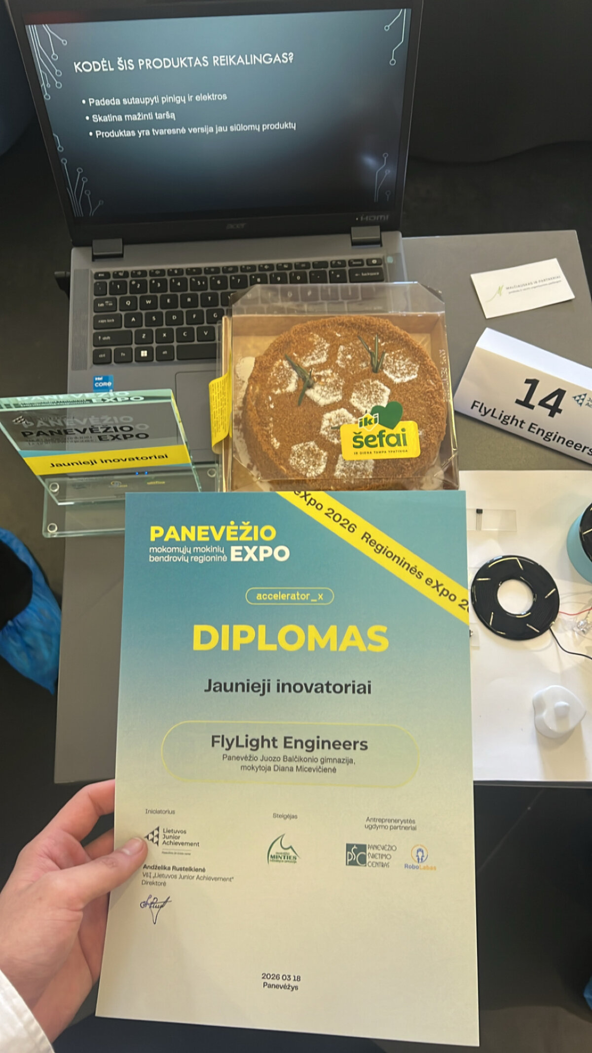 Didžiuojamės, kad šiame renginyje Panevėžio Juozo Balčikonio gimnazijai atstovavo II b klasės komanda: K. Braidokas, L. Nabutaitė, U. Papinigytė, K. Samochinas ir M. Šidlauskis, įkūrę mokomąją mokinių bendrovę „FlyLight Engineers“. Mokiniai pristatė savo sukurtą produktą – tvarią, 3D spausdintą saulės energija įkraunamą žvakę kaip pigesnę alternatyvą rinkoje egzistuojančioms įvežtinėms. Džiaugiamės galėdami pasidalyti puikia žinia – mokiniai buvo nominuoti ir laimėjo Jaunųjų inovatorių prizą, įrodydami, kad kūrybiškumas, atsakomybė ir inovatyvus mąstymas gali virsti realiais sprendimais, kuriančiais vertę visuomenei.