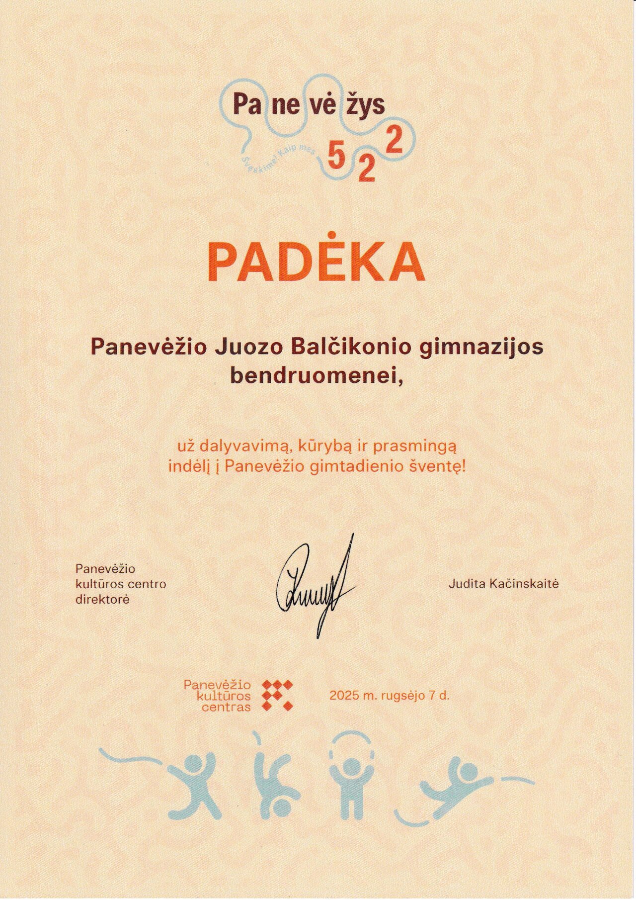 Padėka už dalyvavimą Panevėžio gimtadienio šventėje