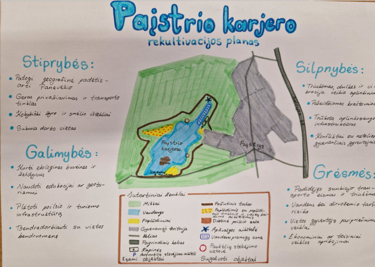 III klasių mokiniai dalyvavo integruotoje veikloje „Karjero rekultivacijos planas“. Dirbdami grupėse ir pasinaudodami žiniomis bei įvairiais skaitmeniniais informacijos šaltiniais, mokiniai analizavo Vidurio Lietuvos žemumos naudingųjų iškasenų bei vandens telkinių žemėlapius, tyrė Paįstrio karjero geografinės padėties ypatumus. Atliekant šį darbą teko taikyti dalykinę integraciją – remtis žiniomis ir įgūdžiais, įgytais per dailės pamokas. Nustatę vietovės panaudojimo galimybes ir grėsmes, mokiniai parengė karjero pritaikymo visuomenės poreikiams planų projektus. Šio darbo rezultatai buvo pristatyti pamokose.