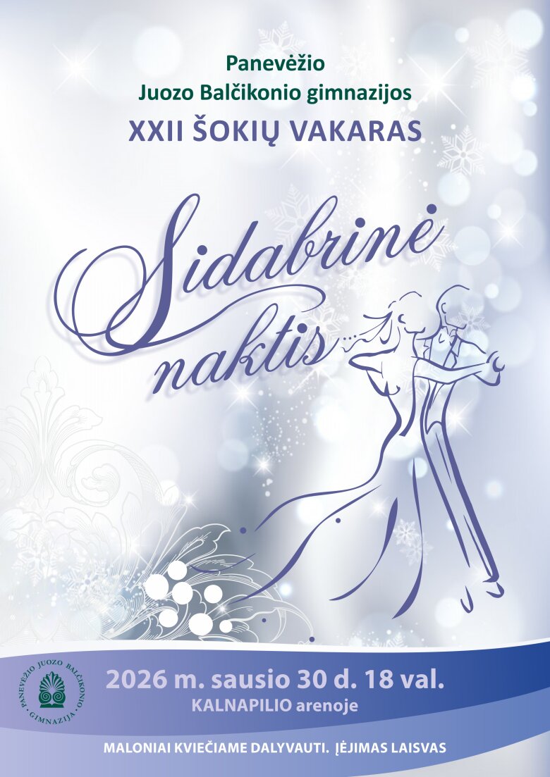 Jau 22-ąjį kartą visus, mėgstančius šokį, muziką, grožį, kviečiame į šokių vakarą „Sidabrinė naktis“, vyksiantį Kalnapilio arenoje. Beveik 300 trečiokų ir ketvirtokų parodys, ką išmoko per šokių pamokas, suksis daugiau nei 140 porų. Vakare gros gimnazijos lengvosios muzikos orkestras, dainuos mišrus jaunimo choras, šoks jaunimo liaudies šokių kolektyvas „Siaustinis“, savo šokiais džiugins svečiai iš Rygos Agenskalno valstybinės gimnazijos. Ne tik grožėsimės šokėjais, bet ir rinksime geriausias poras. Maloniai kviečiame dalyvauti!